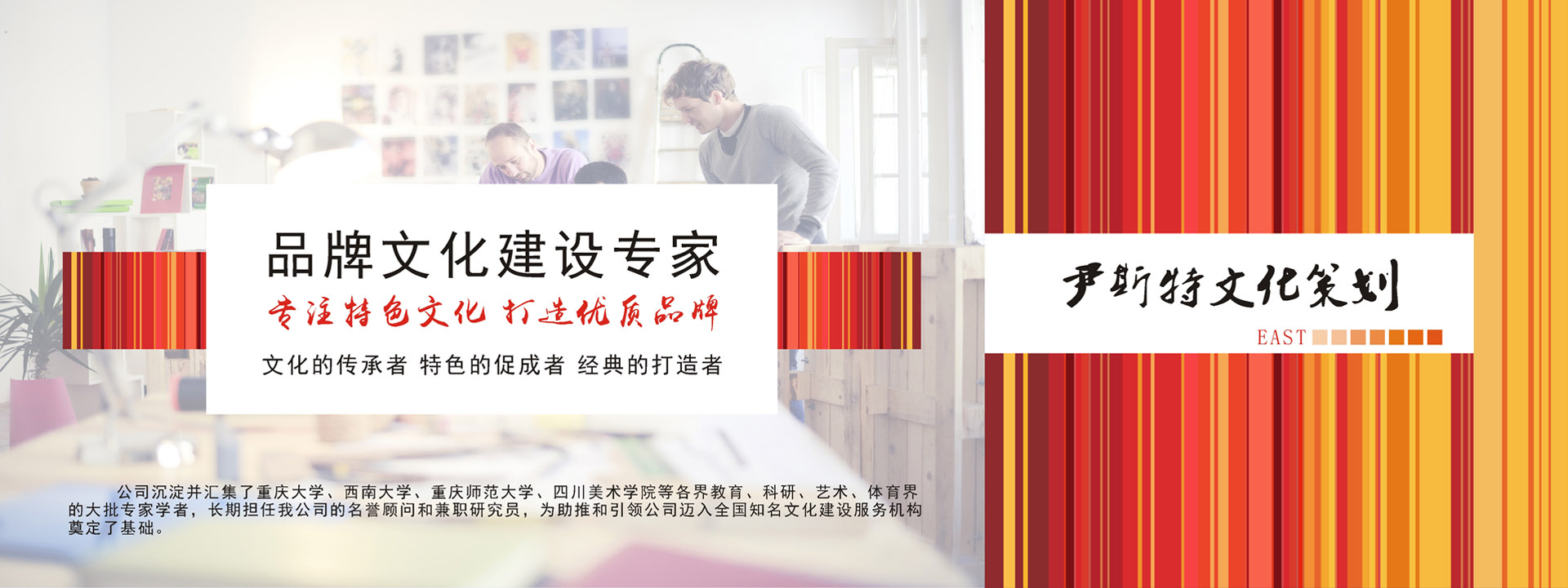 重慶尹斯特文化傳播有限公司全體同仁堅守“文化的傳承者,特色的促成者,名企的打造者”的服務宗旨,齊心協(xié)力,不斷進取,攜手為西部乃至全國的企業(yè)策劃和企業(yè)文化建設事業(yè)作出新的貢獻。
